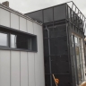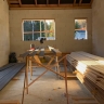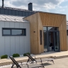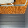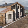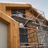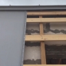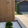 8. Фасад. Два черновых армирующих слоя, чистовое покрытие структурная штукатурка барашек белый цвет + вставки из сосновой рейки натуральный цвет.