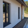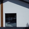 Белый штукатурный фасад со вставками деревянной рейки